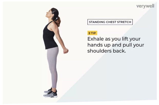 Standing stretch of chest and shoulders, [ID: chest_stretch]