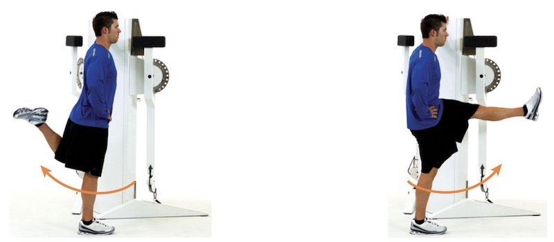 Front-to-back - Stand perpendicular a wall or counter. Hold on and swing one leg 10 times. Then repeat with other leg.