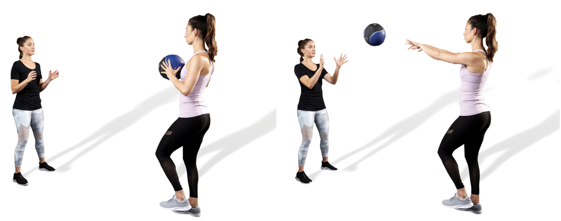 Description: The fitness professional can use several methods to increase the demand of this exercise: 1) Toss the medicine ball at various heights and across the body; 2) Increase the distance between both individuals; 3) Increase velocity of each throw. [ID: bal08]