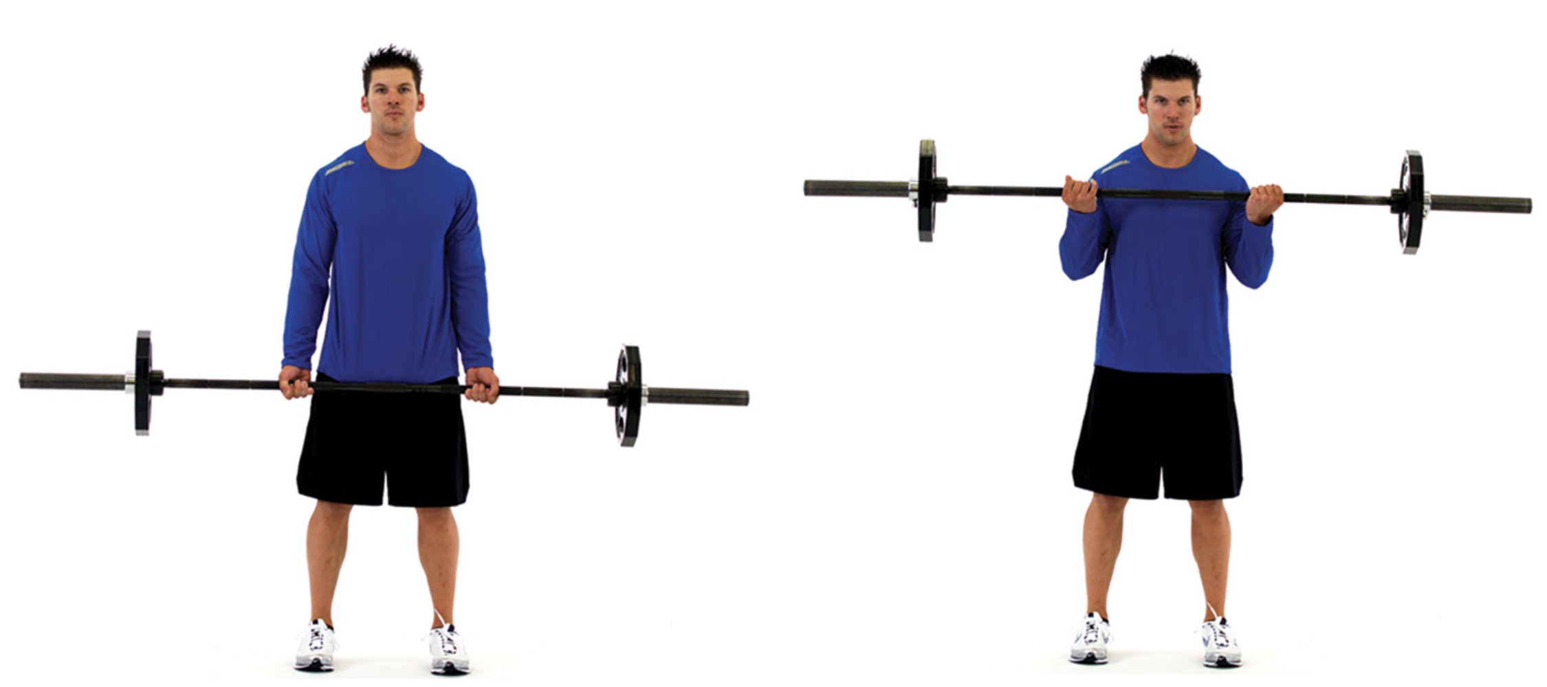 Description: To decrease stress on the elbow, do not grip too close or too wide on the bar. To determine grip width, clients should extend their elbows so their hands fall naturally to their sides, palms facing forward. This is the position where they should be when they grip the bar. [ID: biceps03]