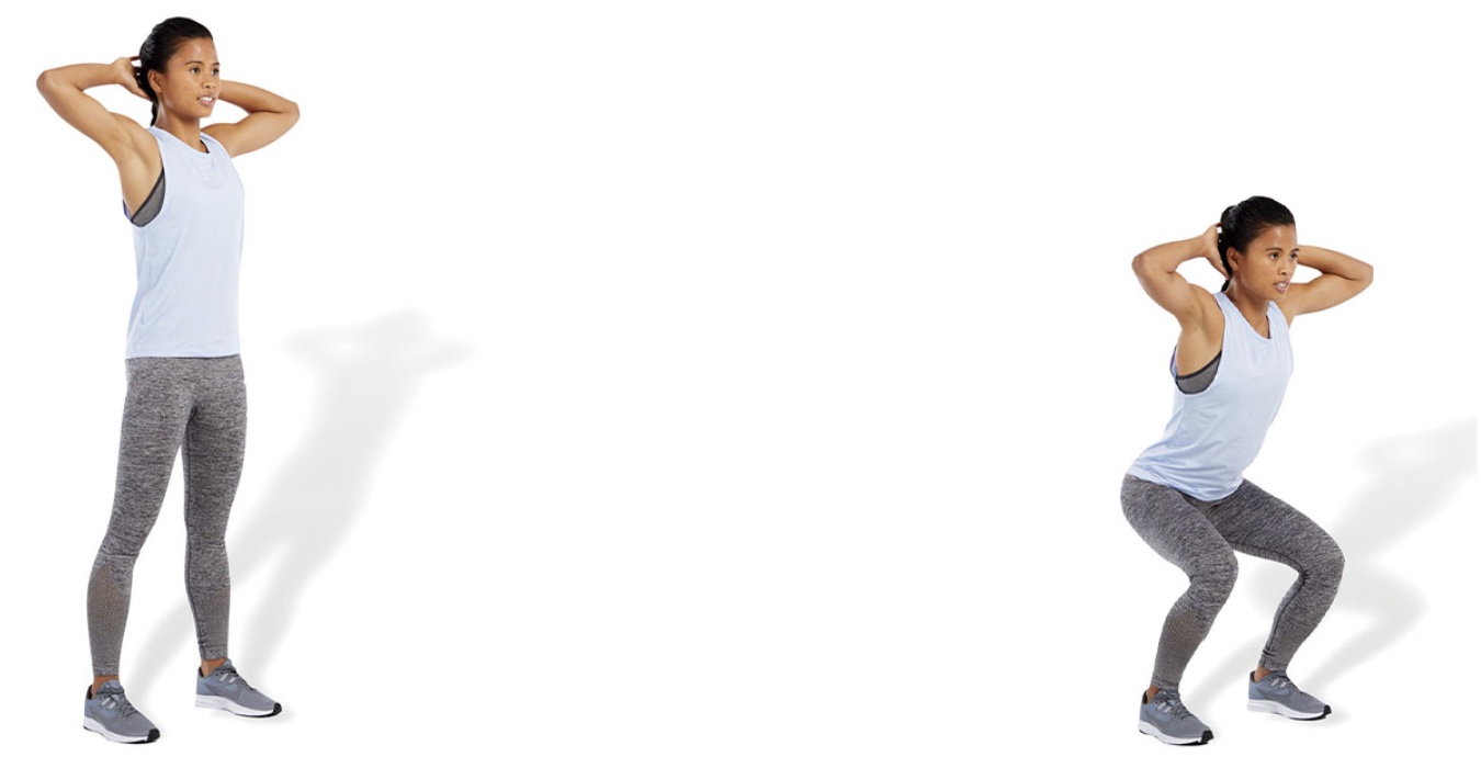 Description: With arms behind the head and feet approximately shoulder-width apart, perform a bodyweight squat. As a progression to this exercise, add a calf raise at the top position after performing the squat. [ID: dynamic01]
