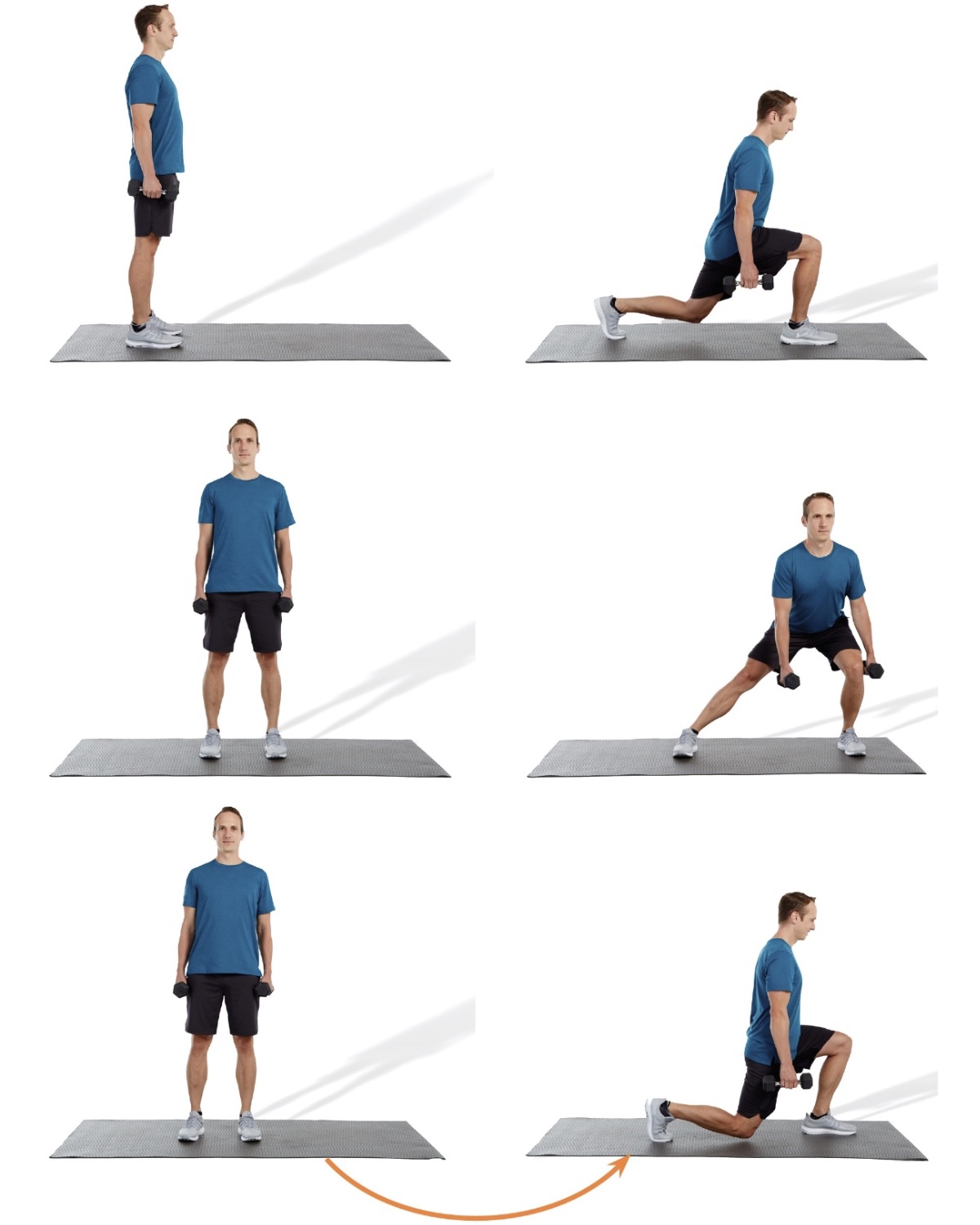 Description: Lunges can be performed in all directions, including front lunges, lateral lunges, and turning lunges. Reverse lunges are also an option. [ID: leg06]