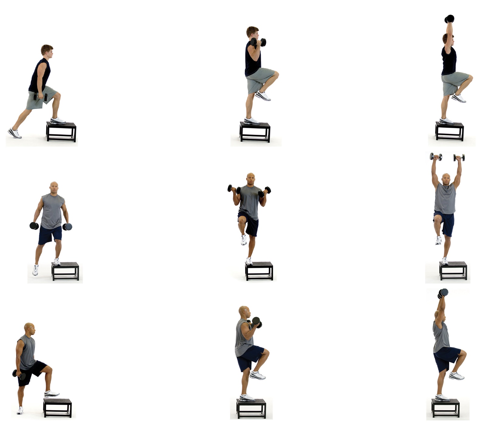 Description: When pressing overhead, make sure the low-back does not arch. This may indicate overactivity of the latissimus dorsi and underactivity of the abdominals. [ID: totalbody02]